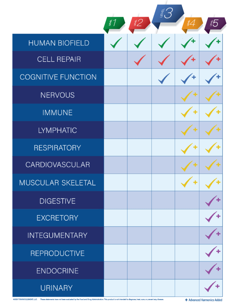 This table shows a comparison between each level. TheĀ Level 3Ā frequency set includes frequencies to support the Human Biofield, Cellular Repair, and Cognitive Function.